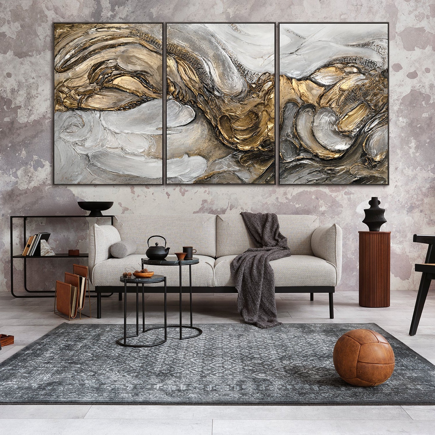 This exclusive hand-painted triptych impresses with its dynamic structure and refined gold and silver tones. The three-part composition creates an expressive wall decoration, adding a luxurious and modern atmosphere to your living space. The intricately textured surface adds depth and uniqueness to the artwork.