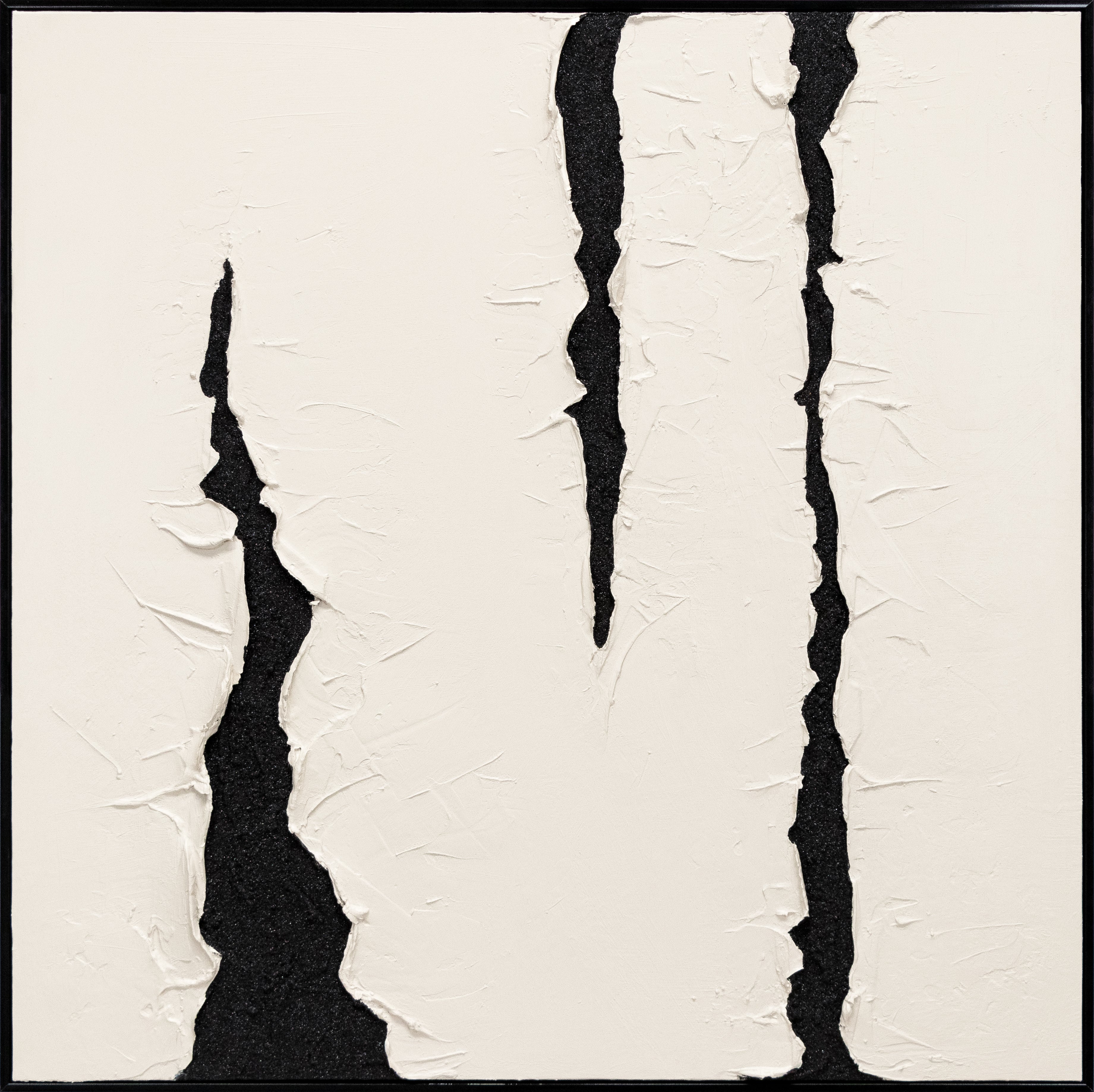 Immerse yourself in the world of abstraction with this stunning hand-painted work of art, which subtly explores the depth and contrasts of black and white. The powerful black lines that break through the textured white surface create a captivating play of light and shadow that commands attention. This acrylic painting is not just a decorative element, but a statement for modern art and minimalist design. It blends seamlessly into contemporary interiors, bringing an elegant yet dramatic touch to your home.