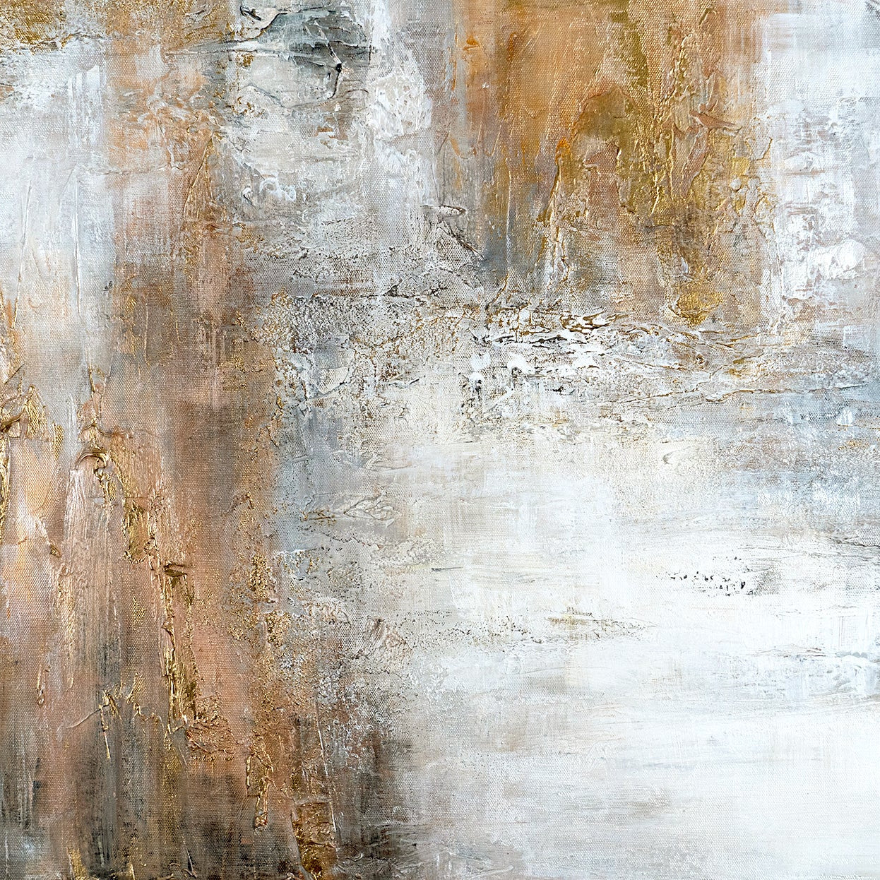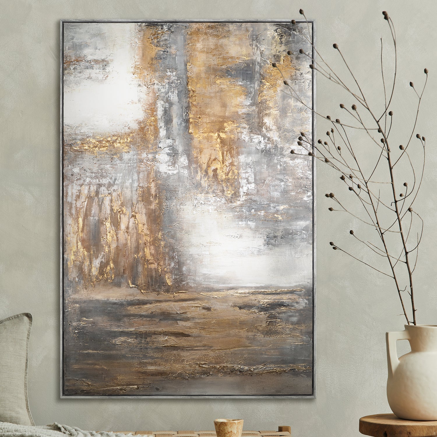 The abstract composition "Dawn" combines warm Gold and Beige tones with structured Gray shades, reminiscent of the awakening of a new day. The thick brushstrokes and fine textures add depth and dynamism to the piece. The vertical orientation emphasizes upward movement, conveying lightness and tranquility – an ideal focal point for rooms with high ceilings or narrow wall spaces.