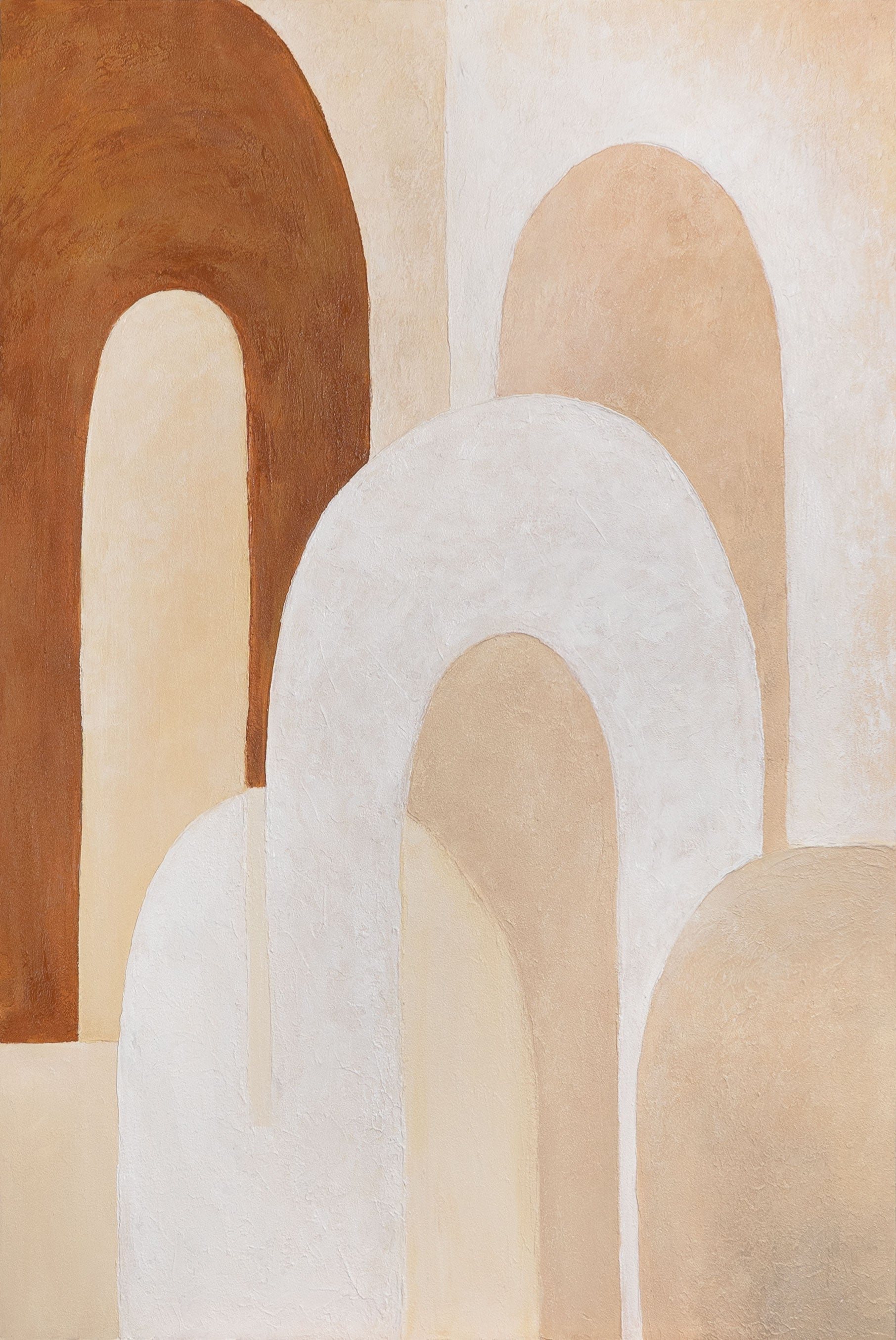 „Atem der Architektur“ vereint geometrische Strenge mit weicher Harmonie. Organische Rundbögen in warmen Beigetönen verschmelzen mit erdigen Braunnuancen und schaffen eine ruhige, architektonische Balance. Die strukturierte Oberfläche bringt Licht und Schatten zum Leben – wie eine Hommage an mediterrane Formen und Materialität.