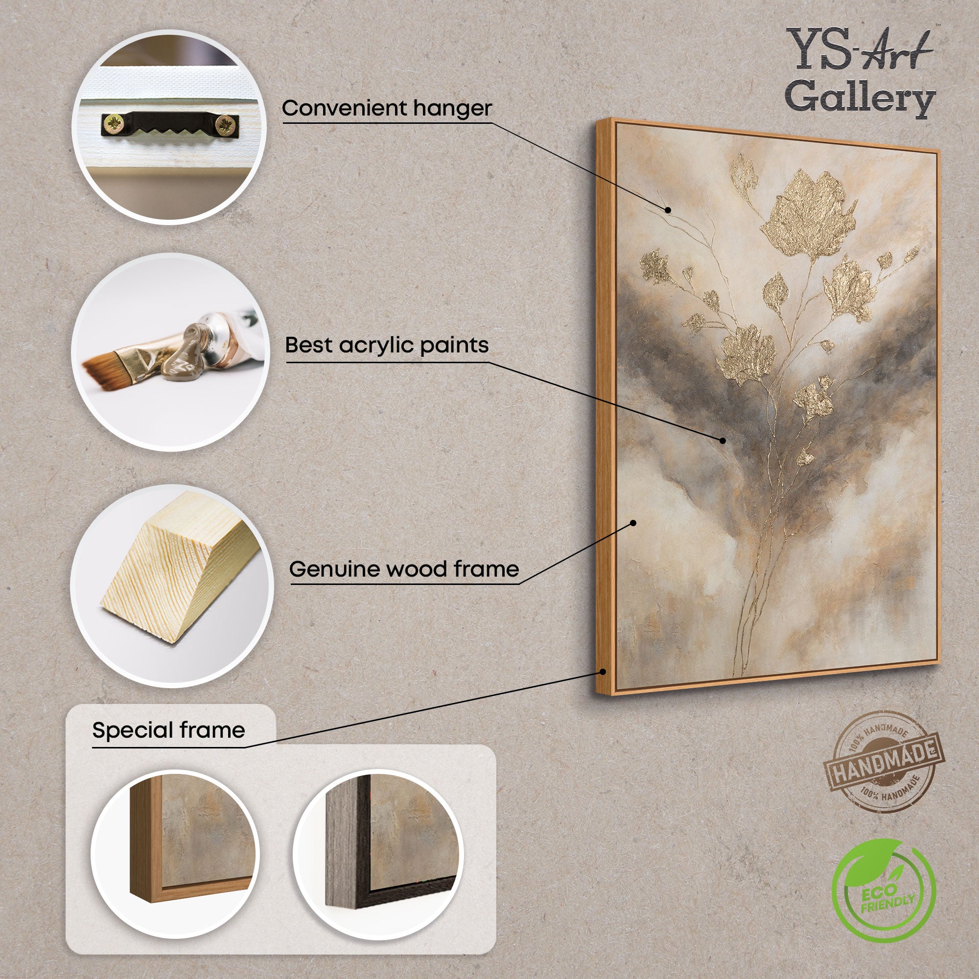• Leinwandbild mit Rahmen „Leuchten in den Wolken“ – Abstrakte Blumen in Goldtönen