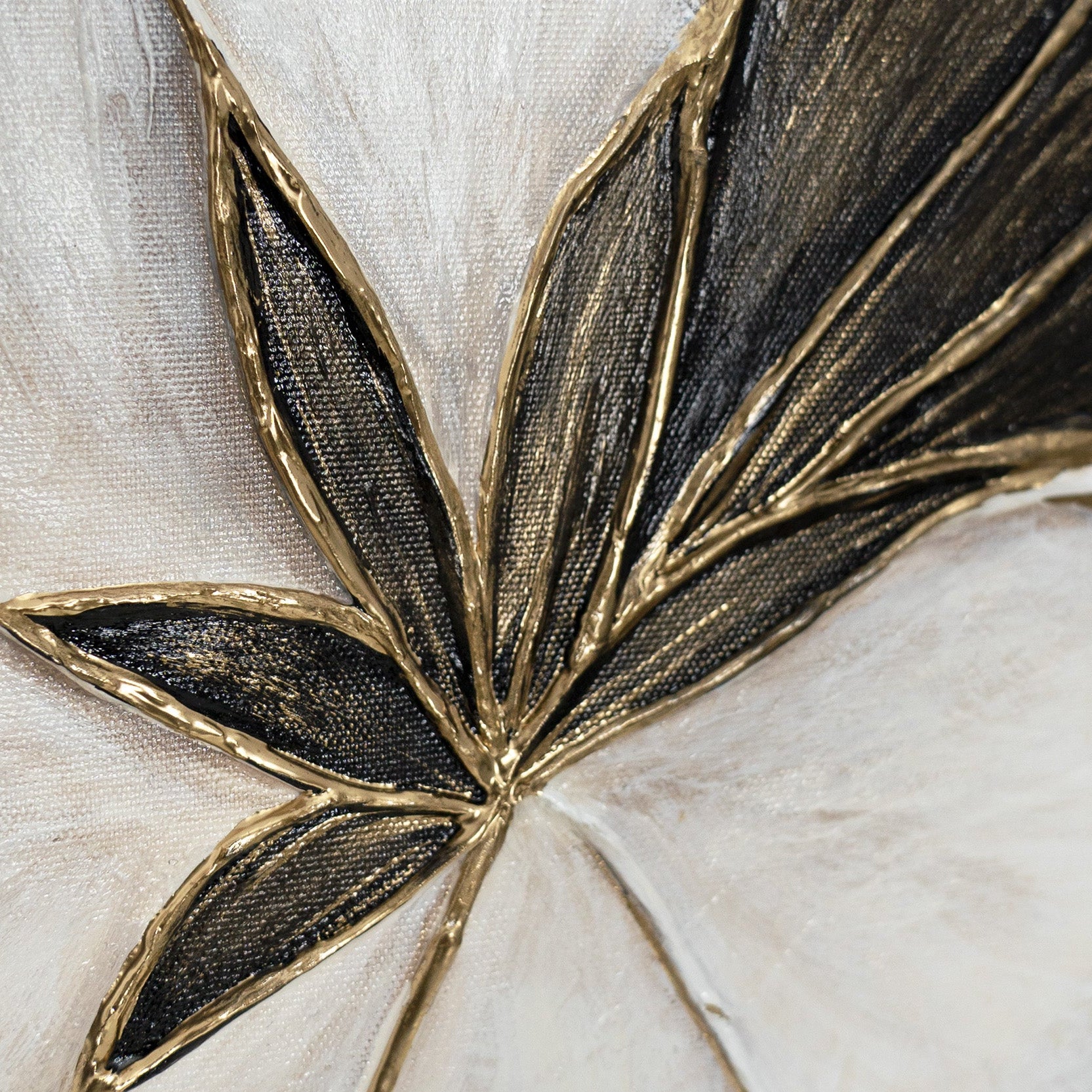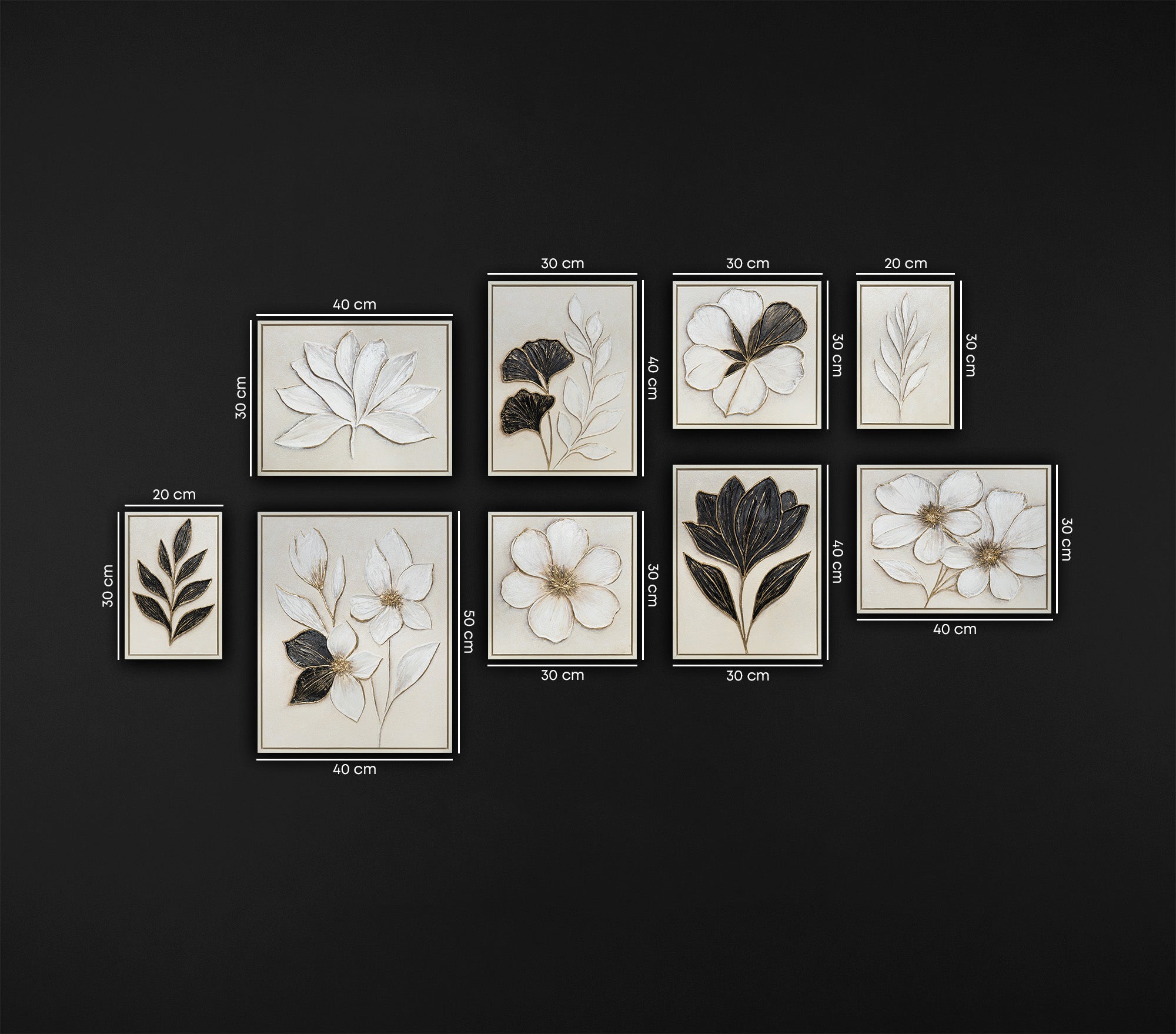 This expressive multi-panel composition blends sculptural floral forms with soft ivory backgrounds and dramatic black accents. Each framed canvas contributes to a cohesive visual rhythm, combining petals, leaves and textured details into a luxurious contemporary statement. The set is ideal for living rooms, bedrooms, dining areas and modern feature walls seeking graceful contrast and artistic depth.