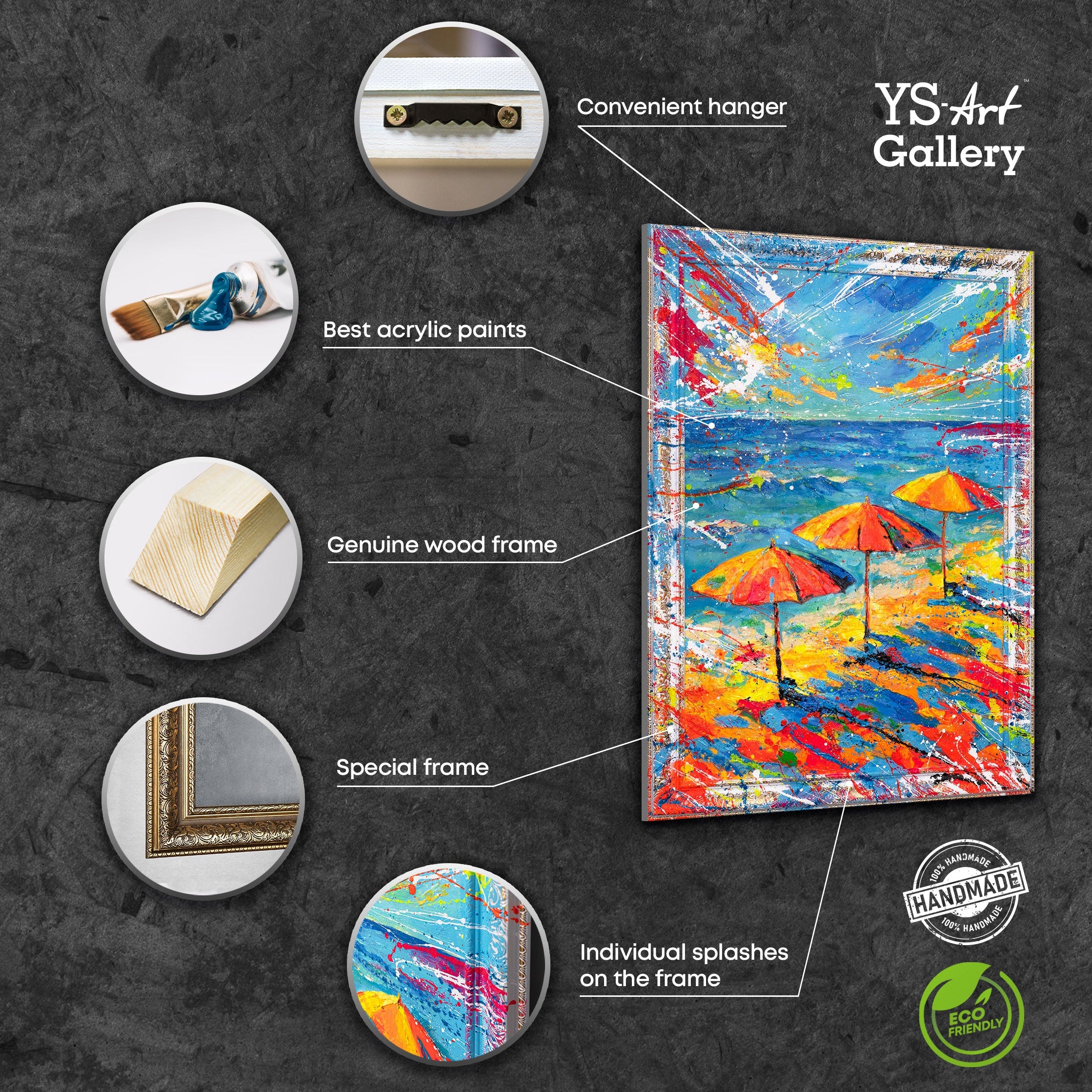 „In the Footsteps of the Sun“ depicts a radiant beach scene with three orange umbrellas blending rhythmically into the seaside landscape. The sky and waves are full of movement, while bold color explosions in red, blue, yellow, and green sweep across the entire canvas. This artwork radiates summer, freedom, and Mediterranean lightness.