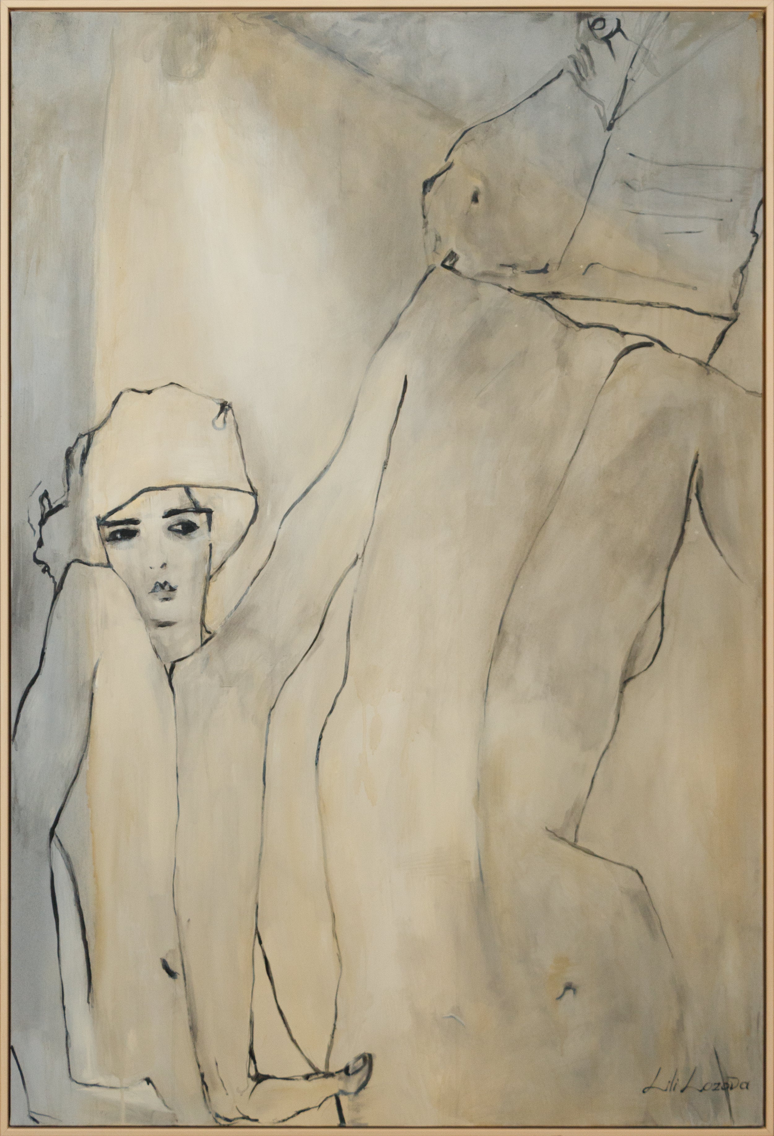 • Großes abstraktes Gemälde Frau in modernem Interieur mit Holzkonsole