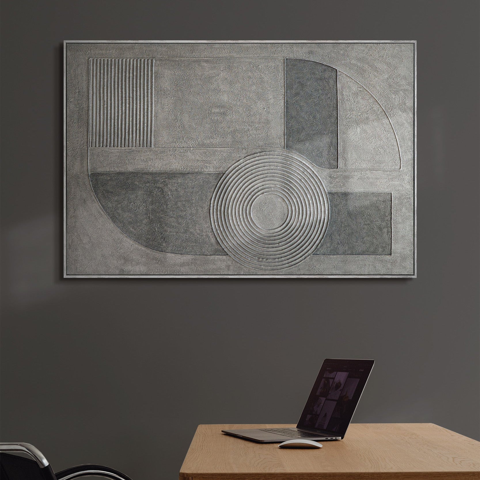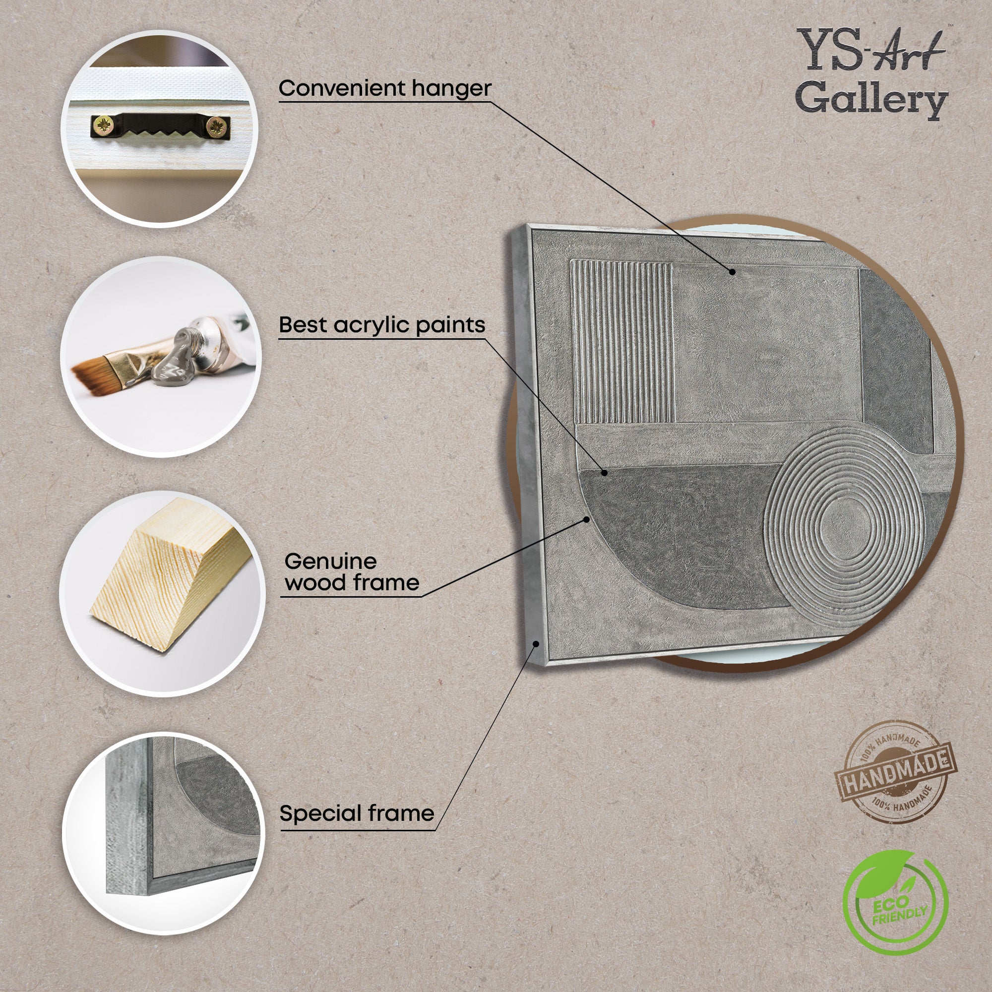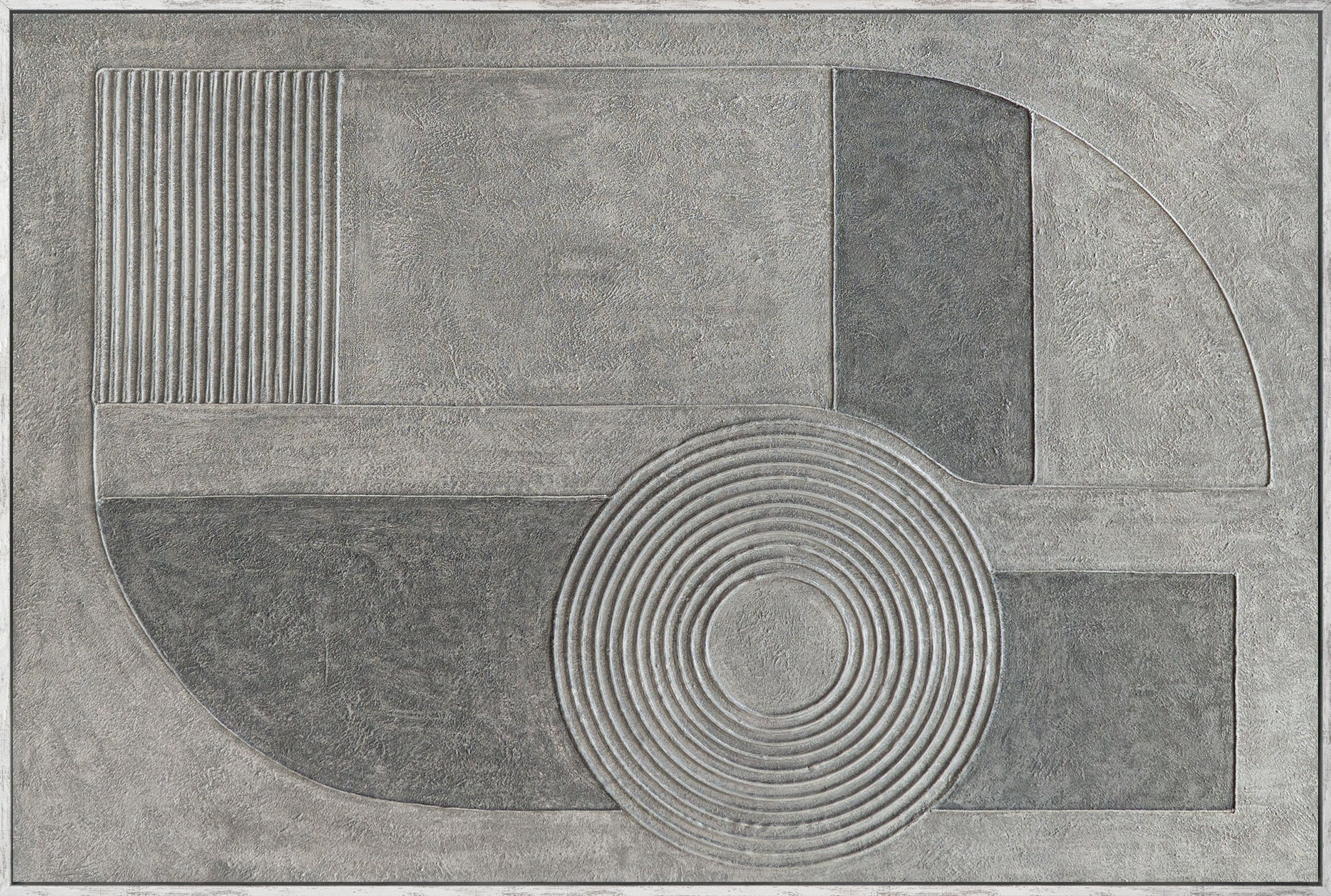 The abstract painting "Gray Chord" unfolds its effect through serene geometric forms, concentric circles, and a finely textured surface. Various shades of gray blend into a harmonious composition that exudes depth and balance without visually dominating. The relief-like acrylic painting creates a captivating interplay of light, shadow, and materiality.