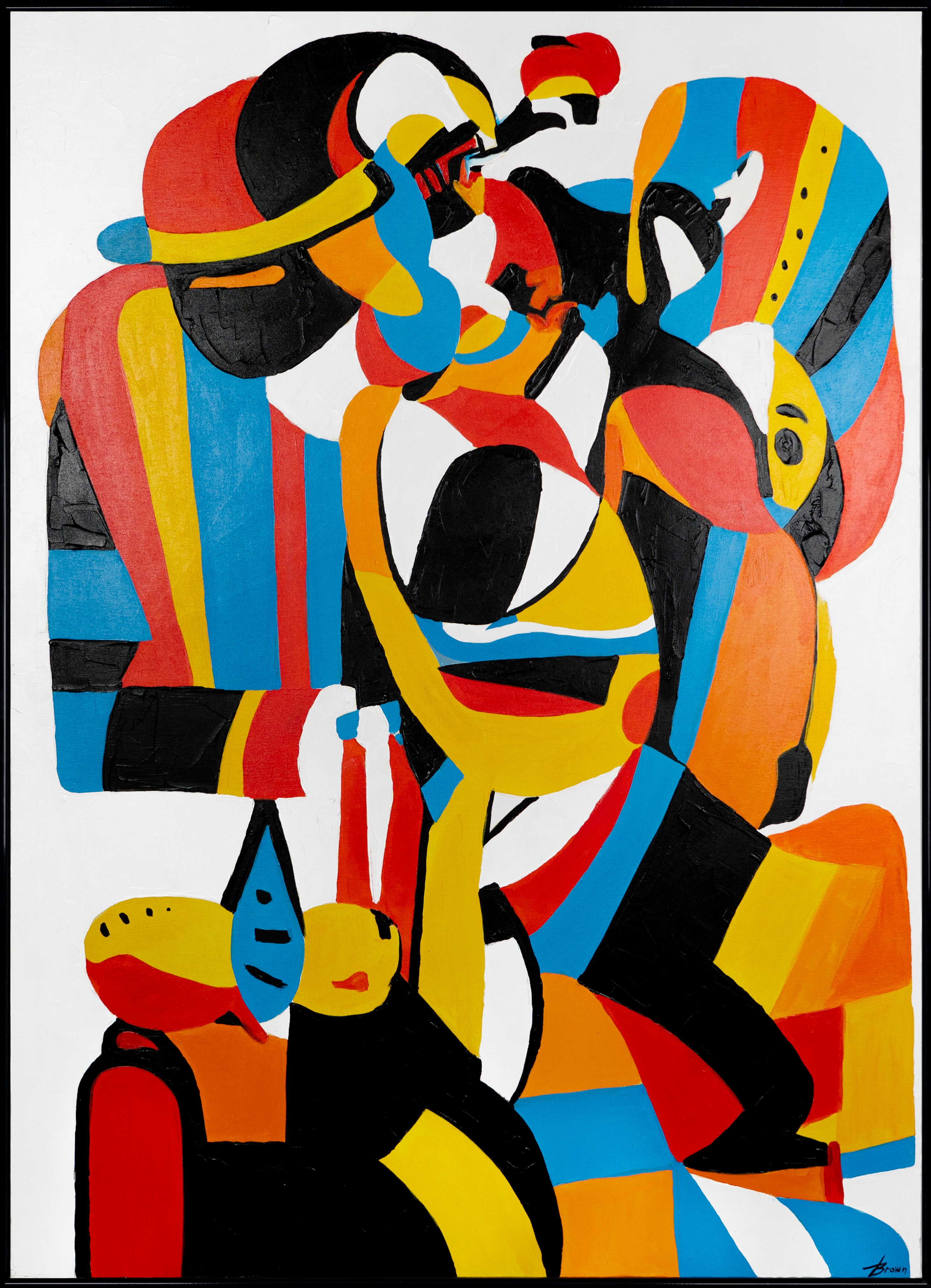 This color-intensive composition immediately draws attention with its clear shapes, bold color fields, and graphic contrasts. The abstract motif resembles a vivid interplay of bodies, lines, and movement – dynamic, powerful, and modern. Carefully applied black contours and vibrant tones in red, yellow, blue, and orange create visual tension, making the painting appear alive.