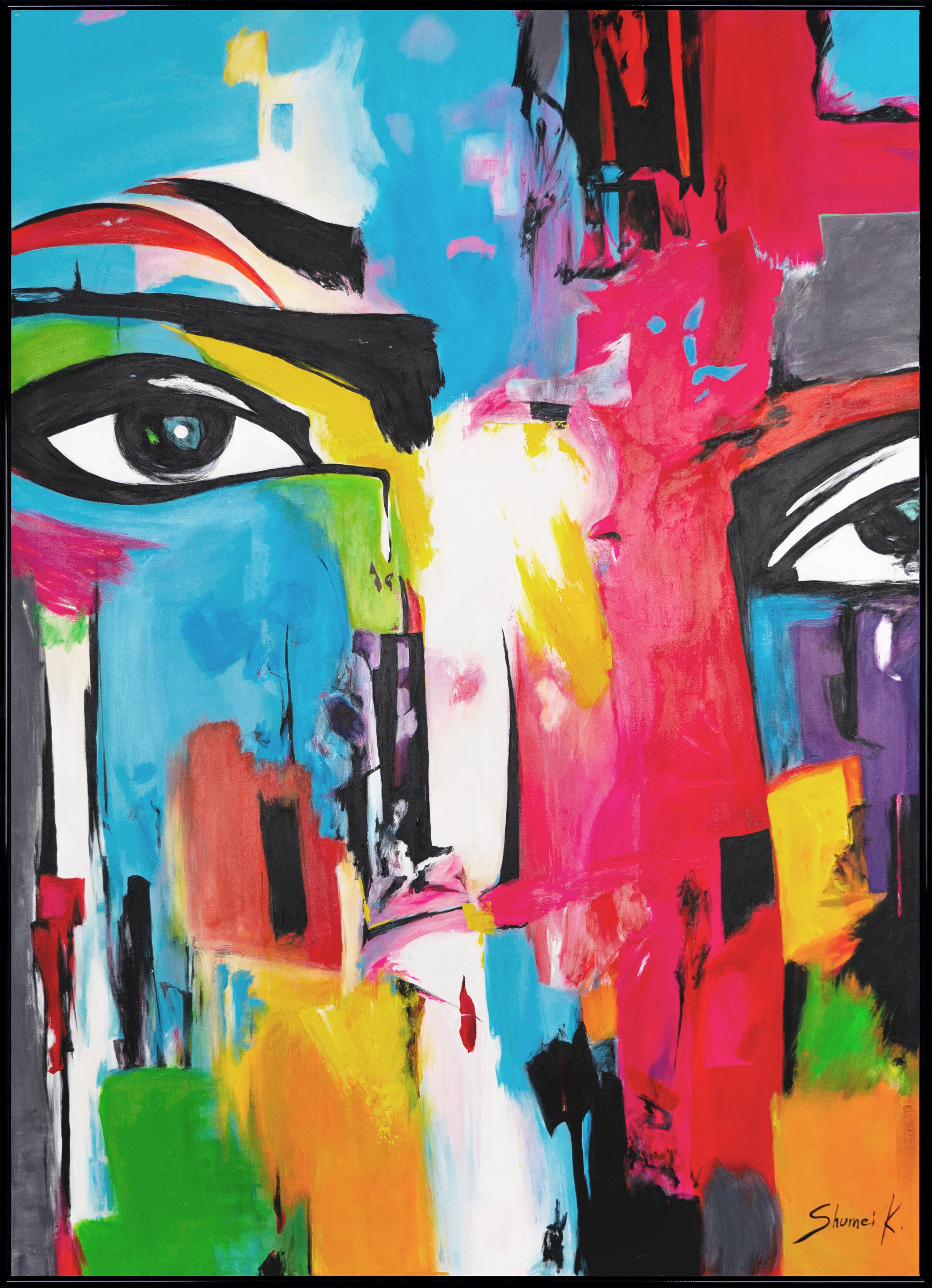 A striking canvas painting that combines vibrant colors with modern abstraction: "Glassed View" features a fragmented face in bright Red, Blue, Pink, and Yellow tones – interspersed with black contrasts. The texture of the acrylic paints creates palpable depth, making the composition an intense focal point with an urban flair.