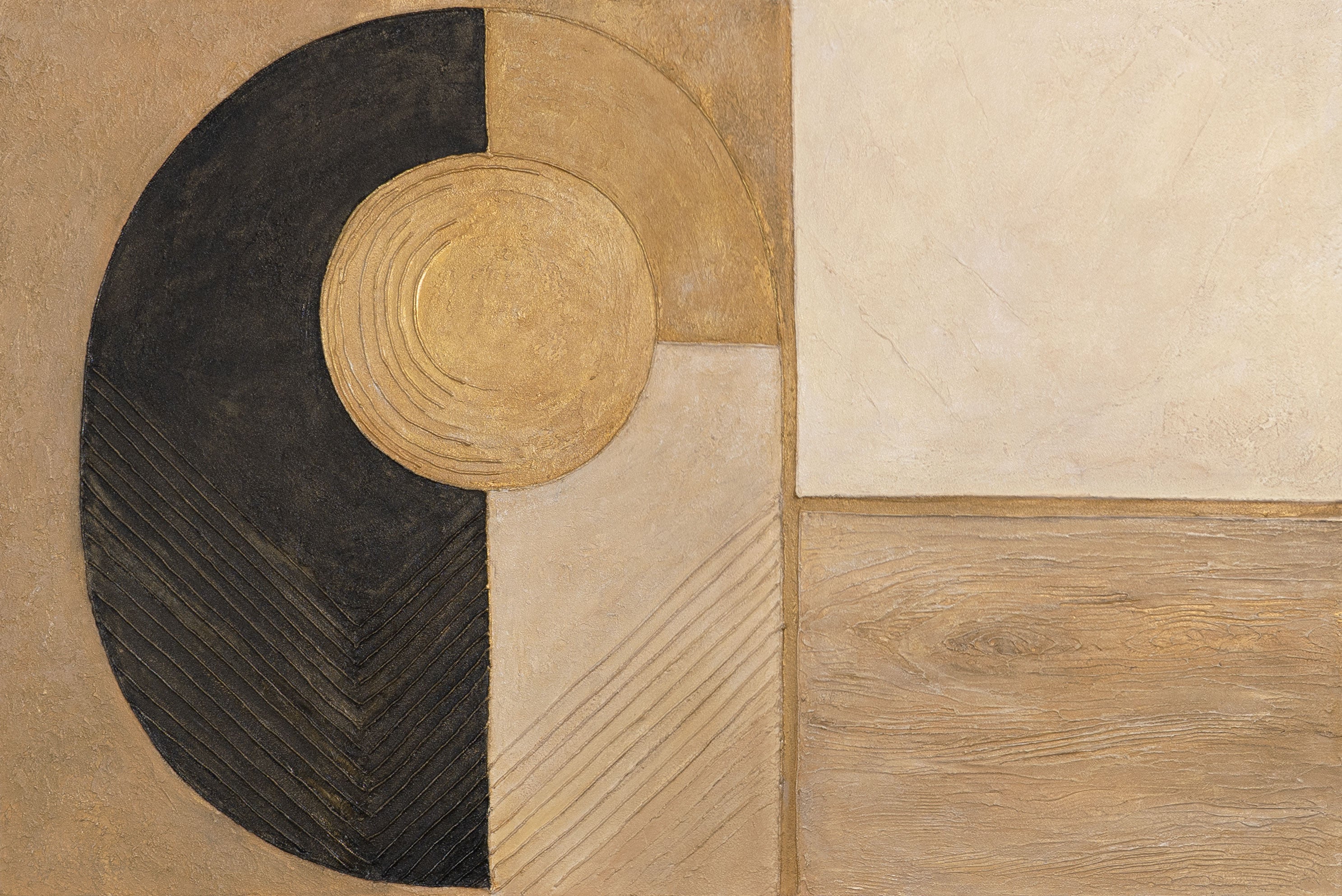 „Form und Textur“ beeindruckt durch seine klare Geometrie und luxuriöse Oberflächenstruktur. Goldene und schwarze Flächen wechseln sich harmonisch ab und erzeugen ein faszinierendes Spiel aus Licht und Tiefe. Die reliefartige Oberfläche macht jedes Detail fühlbar – ein Kunstwerk, das gleichzeitig modern und zeitlos wirkt.