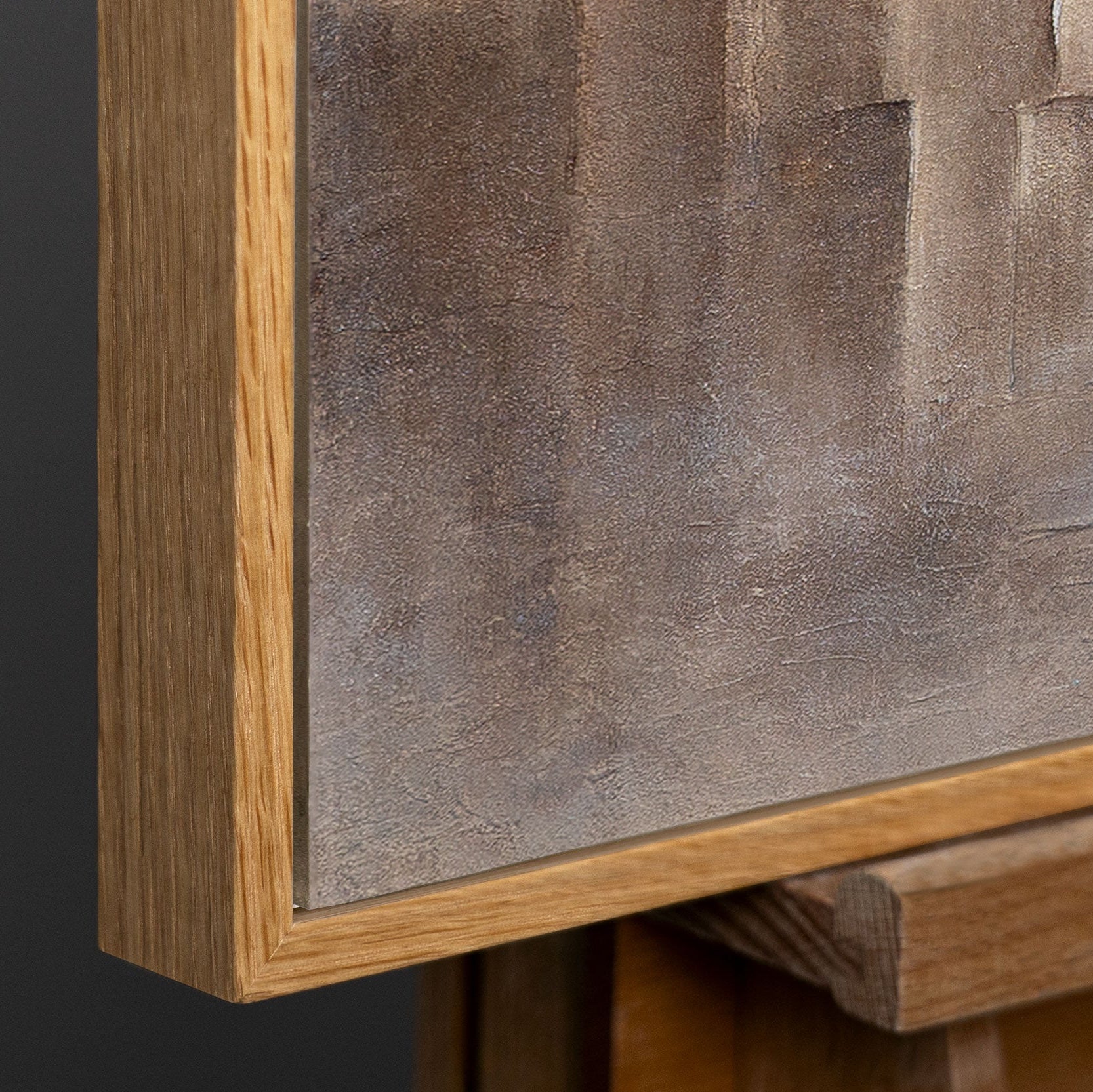 The palette of muted beige and grey sits in the range that interior design tends to call neutral but which, at the level of an abstract canvas painting of this quality, is anything but passive. The tonal variations that hand application produces — the slight warmth of one passage, the coolness of another — give the surface a complexity that flat colour never achieves, and that photography never fully captures. As a landscape modern painting it is made to be lived with, to change slowly in the viewer's perception as the light changes and familiarity deepens.