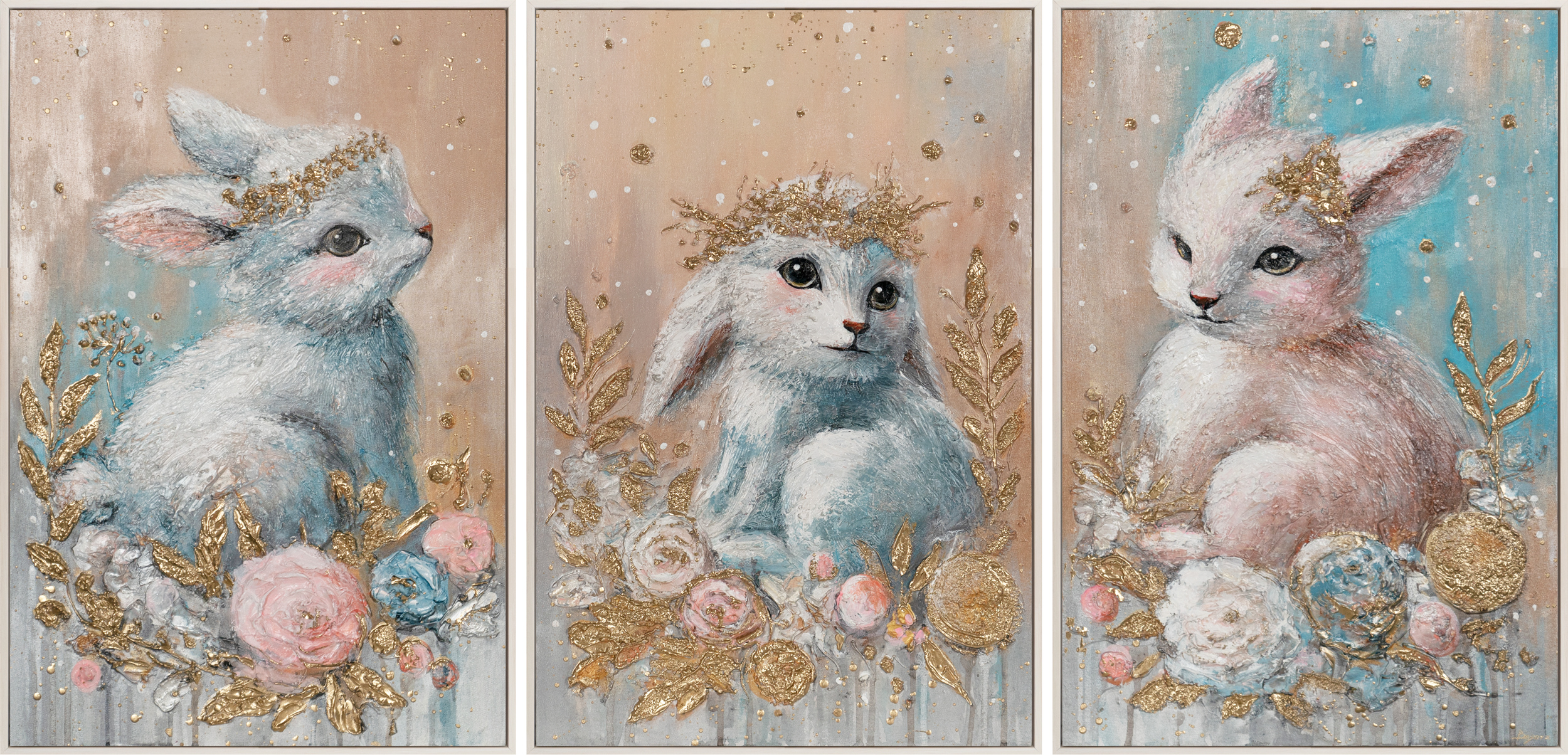 Create a magical atmosphere in your child’s room with this charming hand-painted bunny triptych. Featuring three adorable rabbits surrounded by floral motifs and shimmering golden details, this canvas painting combines warmth, color, and child-friendly elegance. A perfect piece of original artwork for modern kids’ spaces.