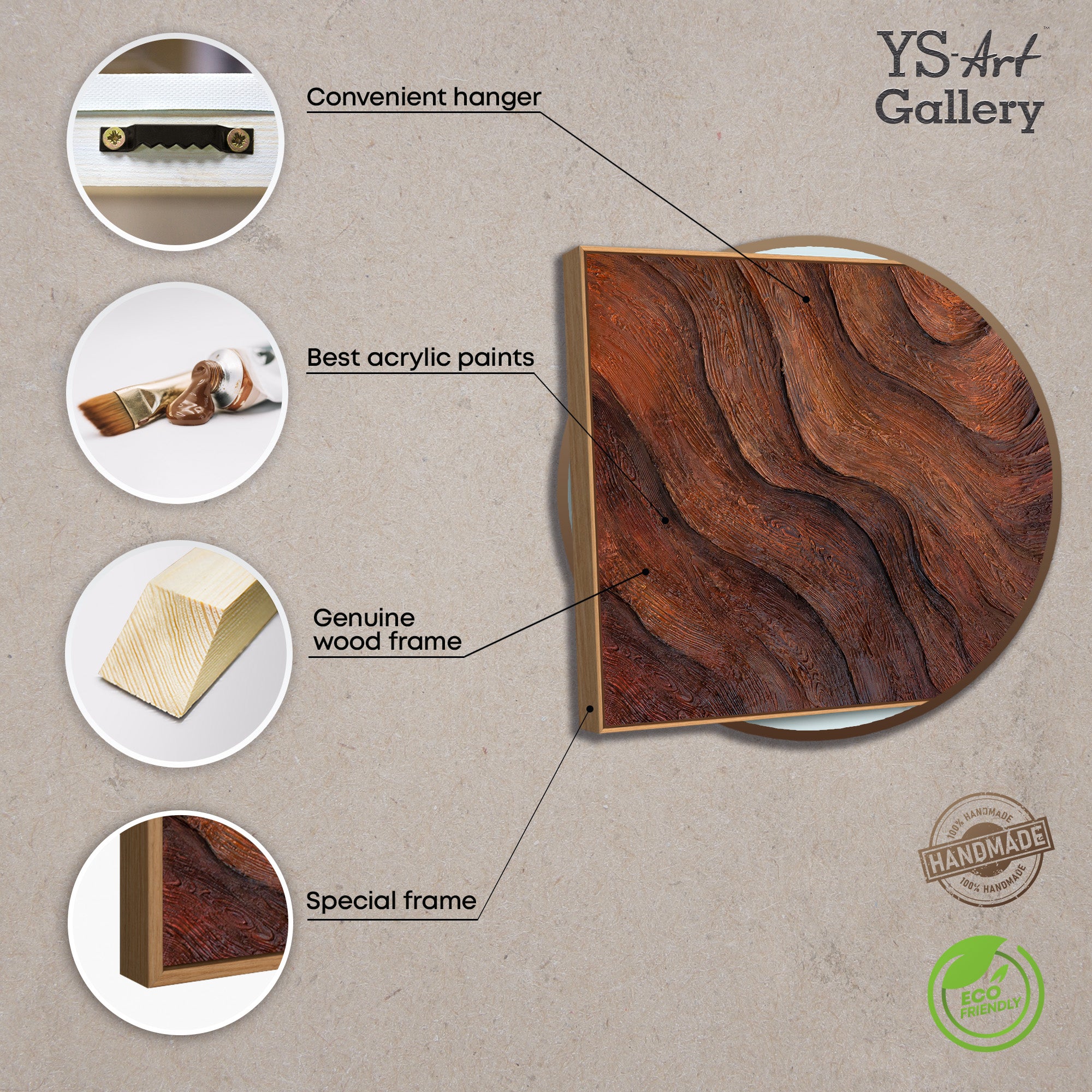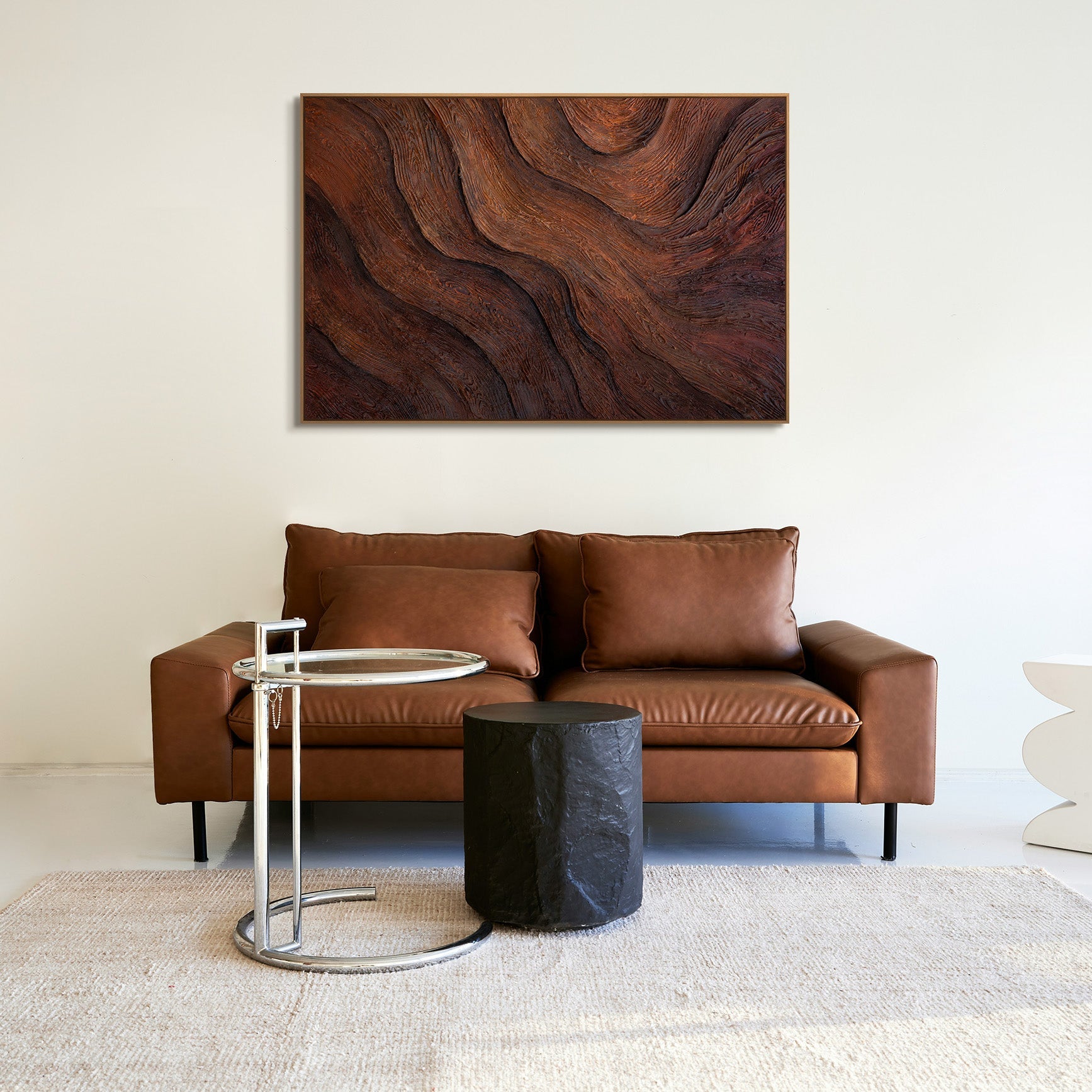 Das handgemalte Wandbild auf Leinwand ist in einem Rahmen in Holzoptik präsentiert und eignet sich ideal für moderne Wohnräume, Büros oder ruhige Interieurs. Durch seine natürliche Struktur fügt sich das Gemälde harmonisch in zeitlose und minimalistische Raumkonzepte ein.